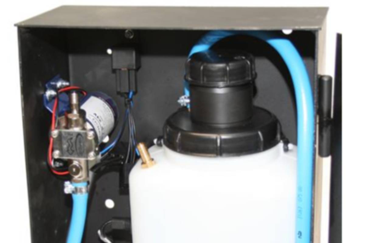 Från vattentanken på maskin pumpas rent vatten till doseringspumpen där blandas Rotstop och vatten till brukslösning som lagras i en driftstank, Under drift suger Droppen stubbpump brukslösningen från driftstanken och pumpar ut exakt rätt mängd till stubben
